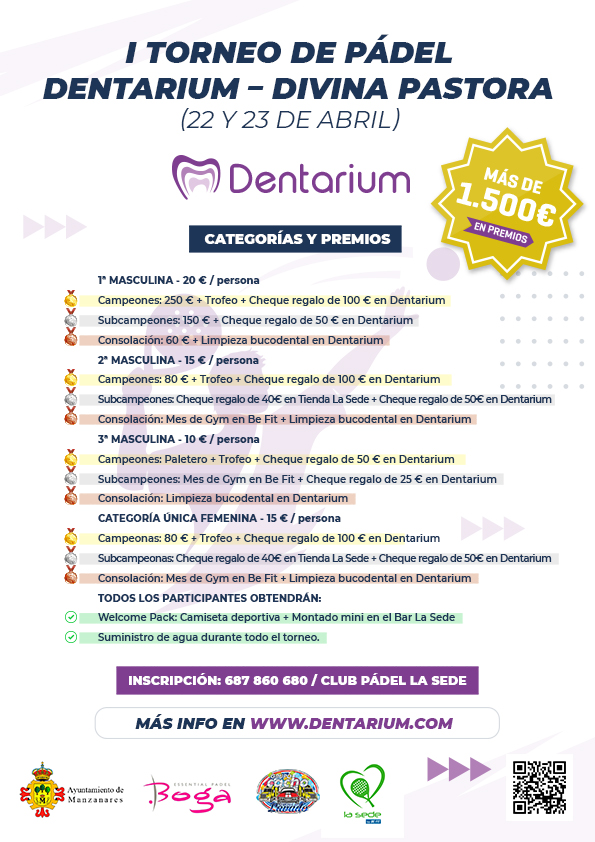 Si has llegado hasta aquí, es porque ya sabes que los días 22 y 23 de abril celebraremos el I Torneo de Pádel “Dentarium – Divina Pastora”, donde nos gustaría que disfrutes con nosotros de un fin de semana en un ambiente e instalaciones inmejorables como el que ofrece el Club de Pádel La Sede de Manzanares, lleno de regalos, sorteos y ¡¡mucho Pádel!!